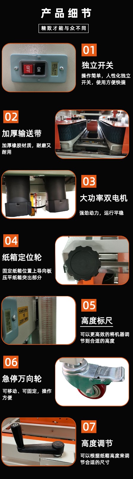 - 紙箱尺寸調(diào)整:當紙箱尺寸發(fā)生變化時,需要調(diào)整輸送帶的寬度和高度。一些封箱機的輸送帶是可以通過手動調(diào)節(jié)支架的位置來改變寬度的,以適應不同寬度的紙箱。對于高度的調(diào)整,可以通過調(diào)節(jié)封箱頭的高度來確保膠帶能夠準確地粘貼在不同高度的紙箱封口上。