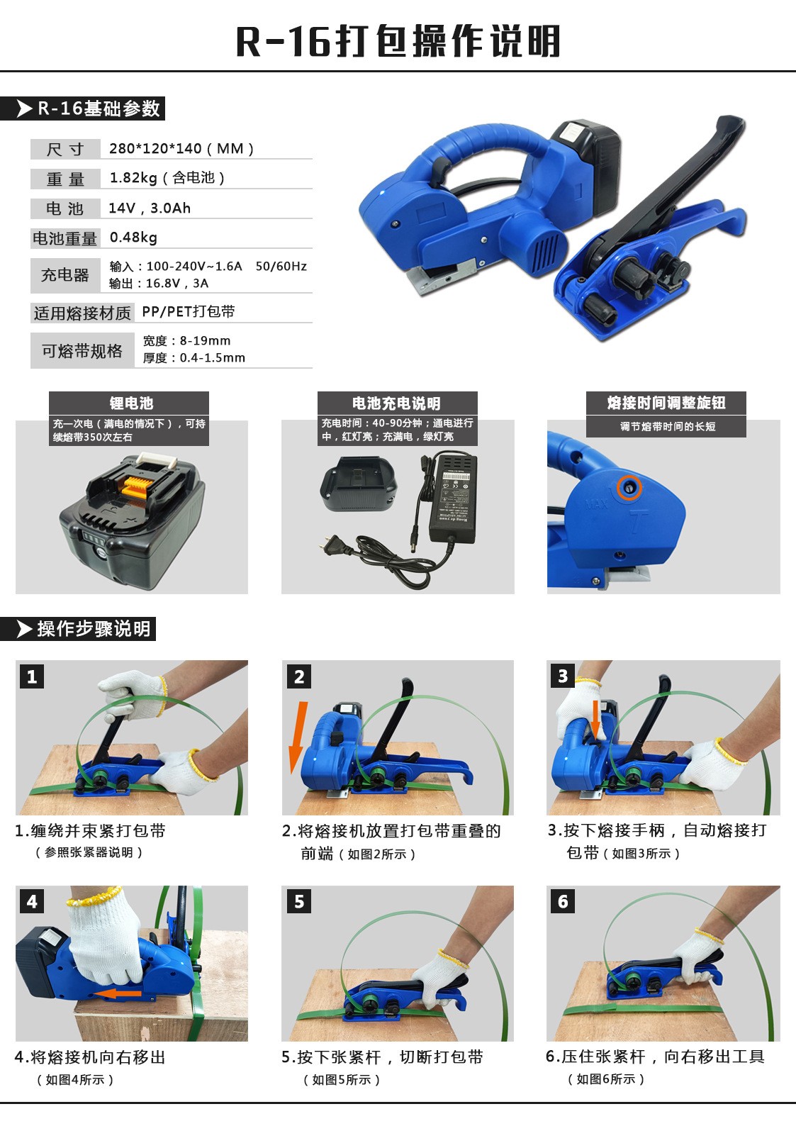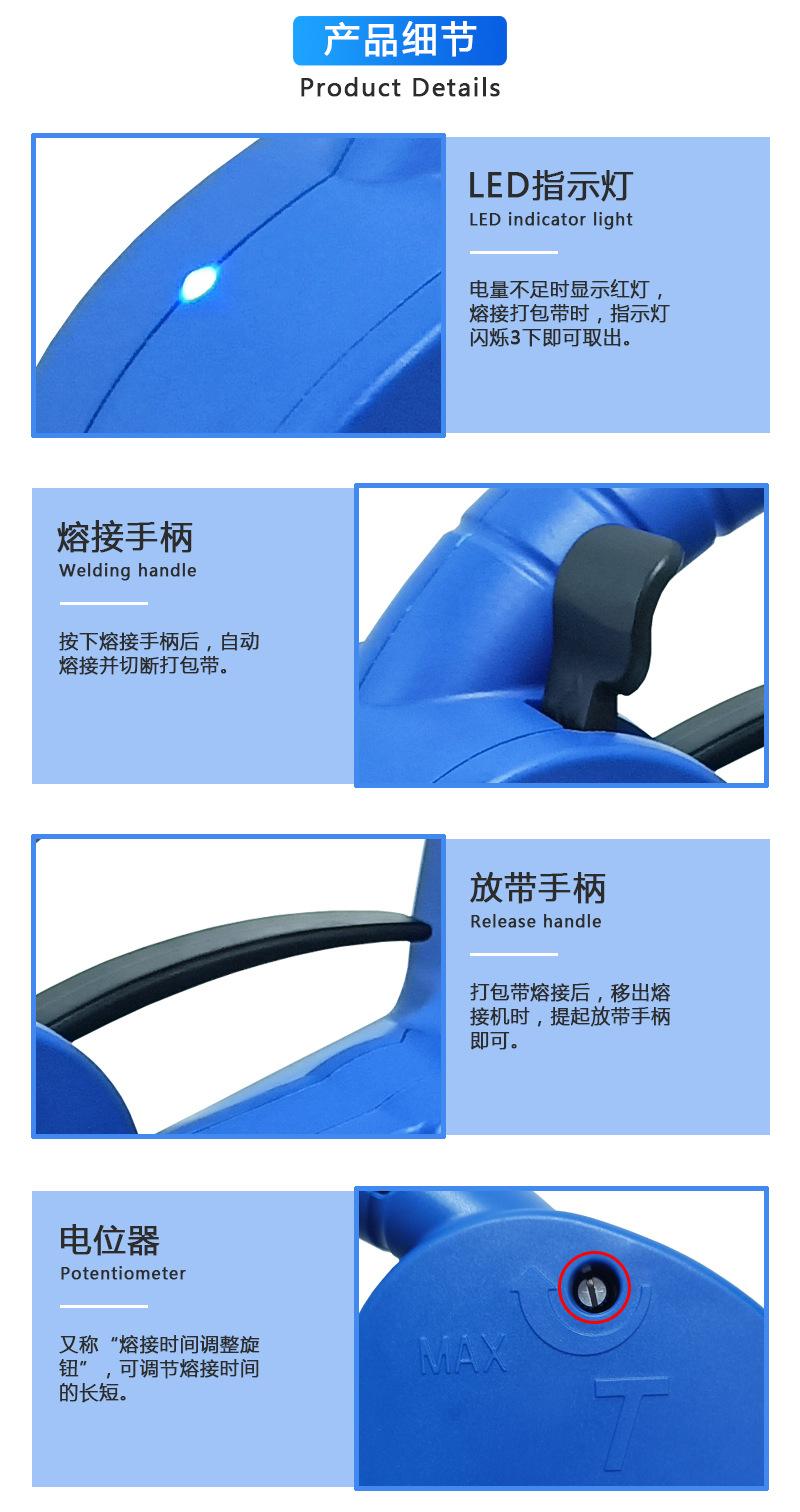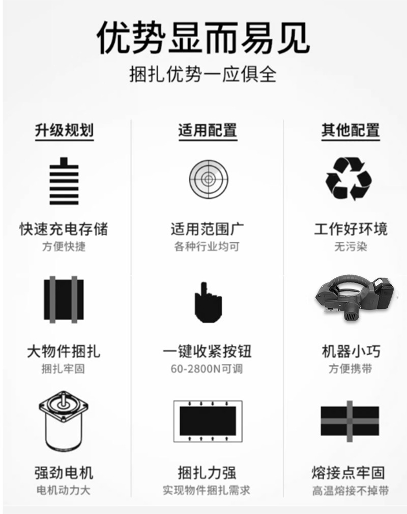 - 快速啟動(dòng)打包:不需要像大型打包設(shè)備那樣進(jìn)行復(fù)雜的預(yù)熱或啟動(dòng)程序。只要安裝好打包帶并做好準(zhǔn)備工作,就可以立即開(kāi)始打包。在一些緊急打包的情況下,如臨時(shí)接到發(fā)貨任務(wù)或者需要對(duì)受損包裹進(jìn)行重新打包,手持打包機(jī)能夠迅速投入使用,節(jié)省時(shí)間。