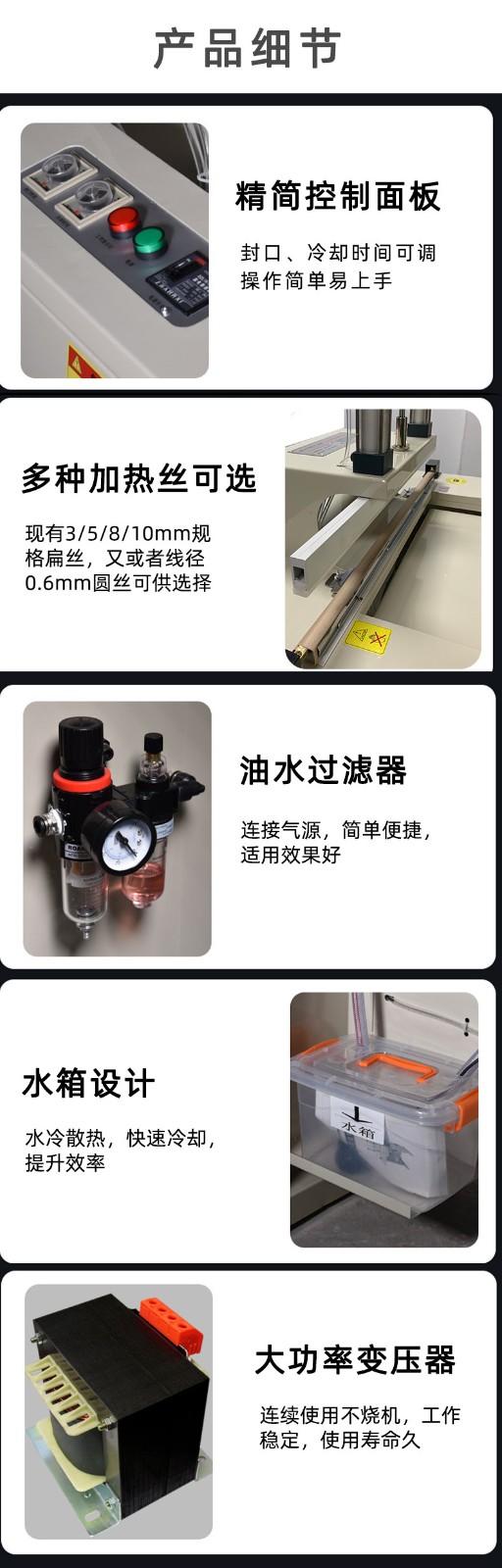 - 產品類型適用性:無論是小型的零售包裝產品,如零食袋、小化妝品瓶的外包裝,還是大型的工業包裝,如化工原料桶的封口、大型電子設備的防塵包裝,水冷封口機都能發揮作用。其可調節的封口參數和不同尺寸的封口裝置選項,使得它可以滿足不同類型、不同尺寸產品的包裝封口需求。