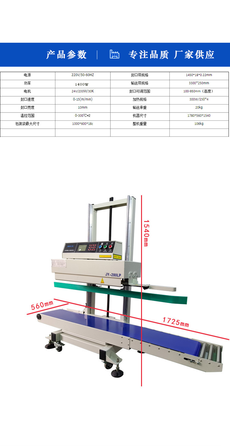 - 封口質量穩定:由于可以精確控制封口溫度、壓力和速度等參數,連續式封口機能夠確保封口質量的一致性和穩定性。封口牢固、平整,密封性良好,能夠有效防止包裝內容物泄漏、受潮或受到污染。在醫藥和化工等對包裝質量要求較高的行業,這種穩定的封口質量尤為重要。