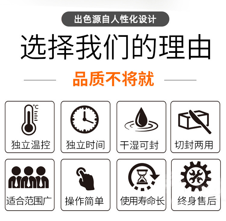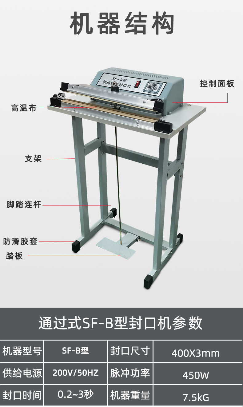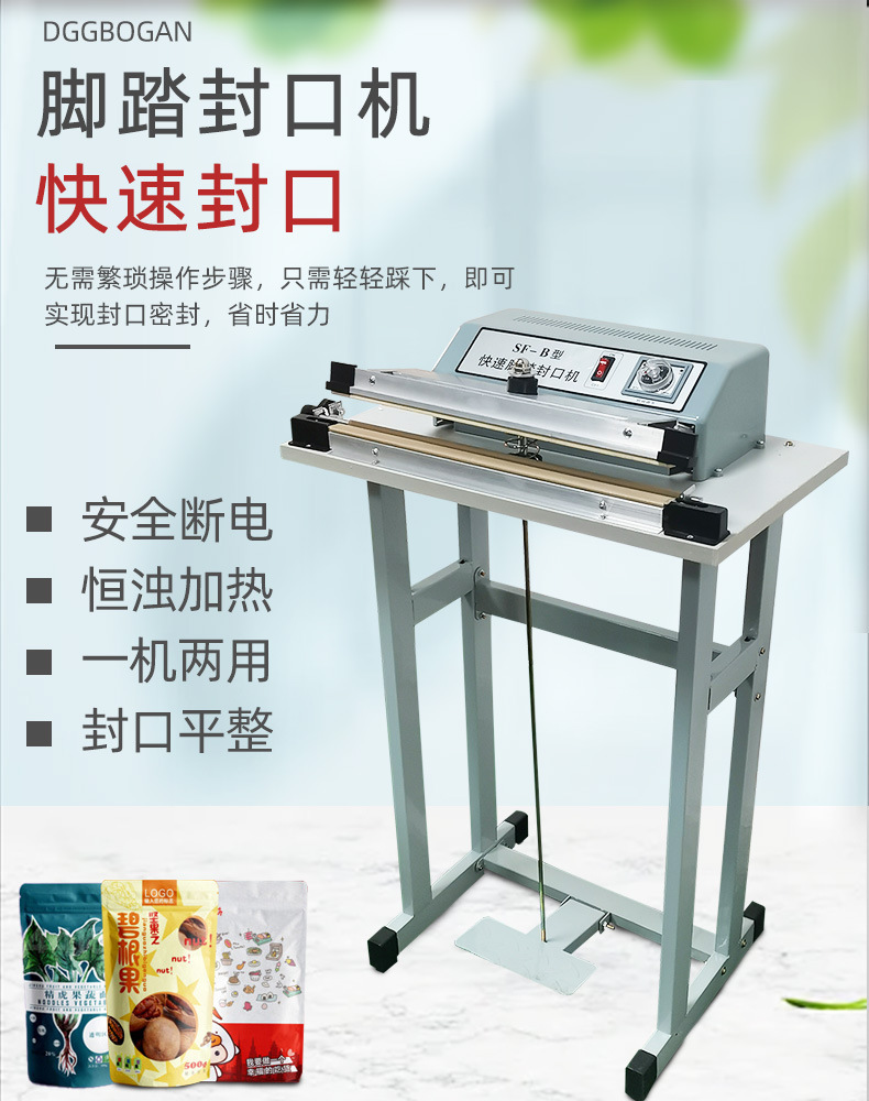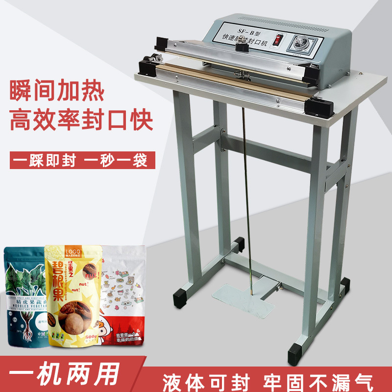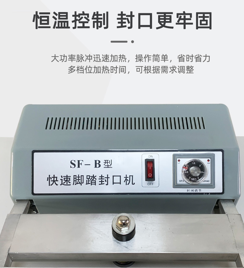 快速腳踏封口機:適用于食品、土特產品、糖果、茶葉、醫藥、五金等行業的小批量包裝,以及家庭、小型商鋪等場所,可對各種塑料薄膜、復合薄膜及鋁塑薄膜進行封口3。