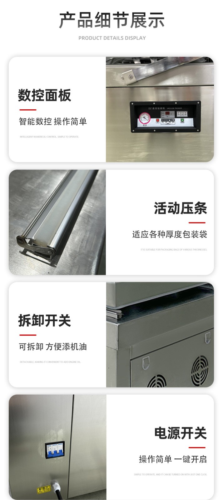 - 制造工藝:大品牌生產(chǎn)工藝成熟,焊接、打磨等工藝精細,真空室密封性好。例如,采用高密度材料制作的 V 形密封條,能保證設(shè)備的密封性和耐壓、耐磨性14。小品牌可能因工藝粗糙,導(dǎo)致真空室有縫隙,影響真空度和封口質(zhì)量。