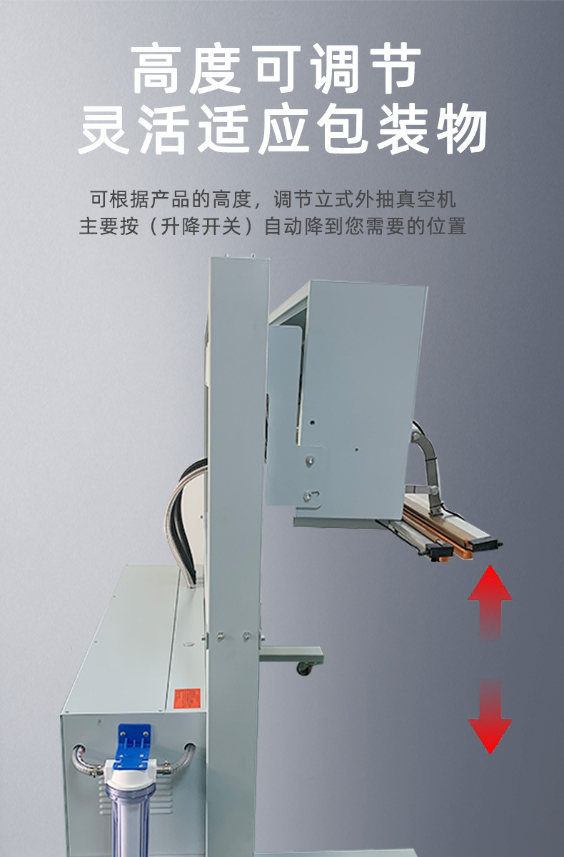 立式可升降真空包裝機的直立式設計使得它在空間利用上比較靈活,占用的地面面積相對較小,適合放置在各種工作場地,如小型食品加工廠、商店后臺等