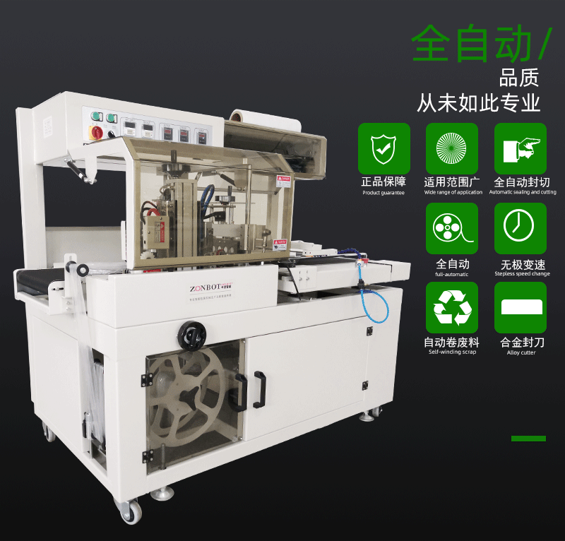 - 薄膜輸送與套膜:與此同時,熱收縮薄膜(常見材質如 PVC、PE、PP 等)會從薄膜卷軸上被源源不斷地輸送出來。當物品被輸送到合適位置時,薄膜會在相關機構的作用下,自動套在待包裝物品的外圍,形成初步的包裹狀態。