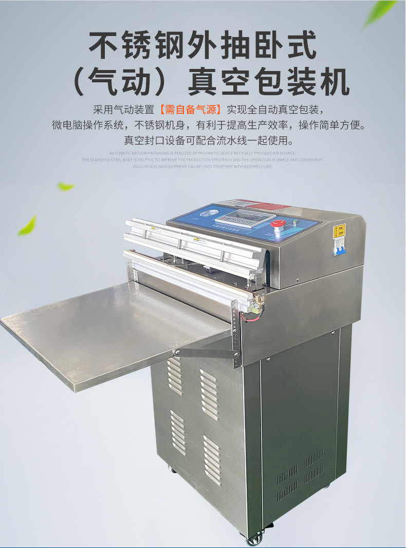 氣動外抽真空包裝機通過氣動系統驅動真空泵工作,將包裝袋內的空氣抽出,達到設定的真空度后,再利用熱封裝置對包裝袋進行封口,從而實現對物品的真空包裝.