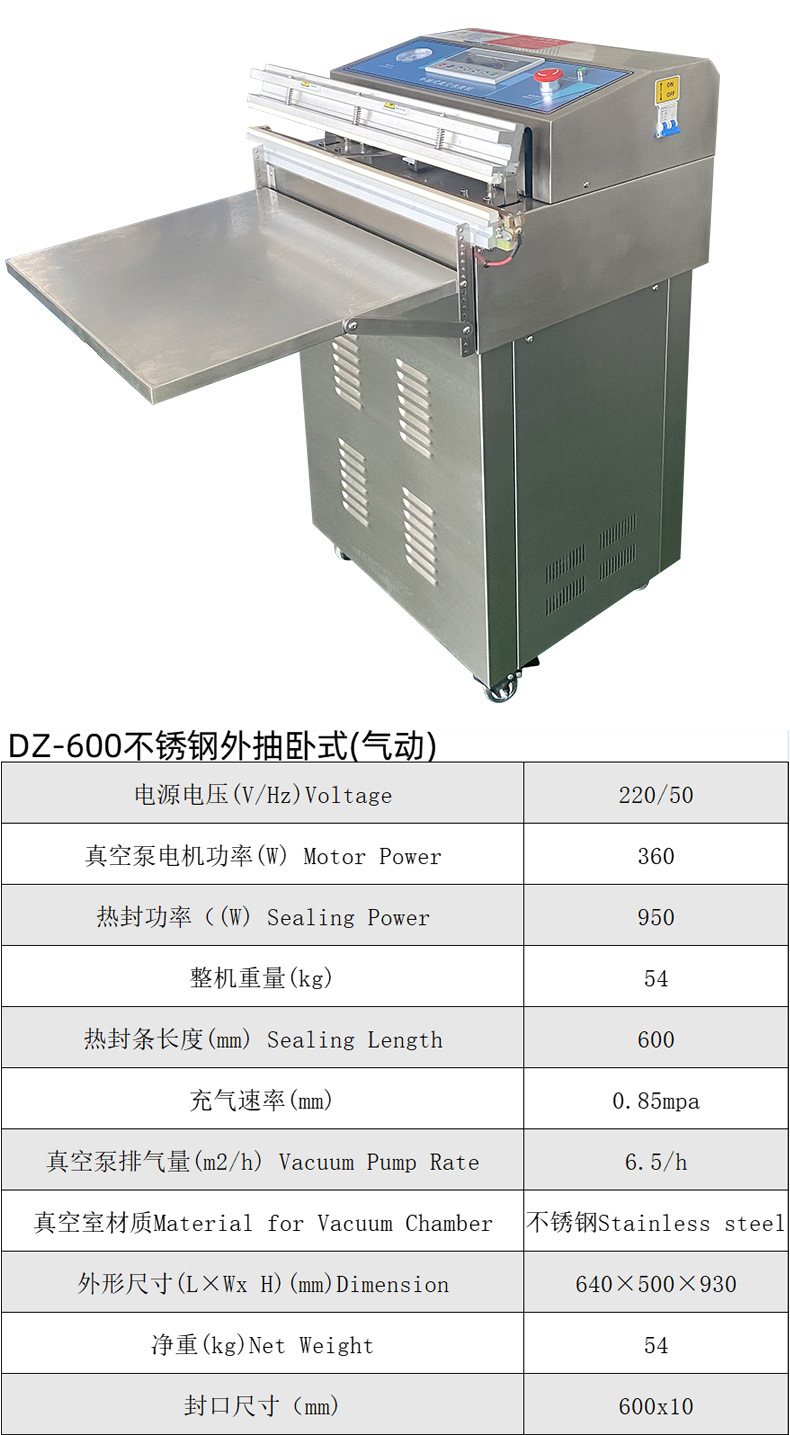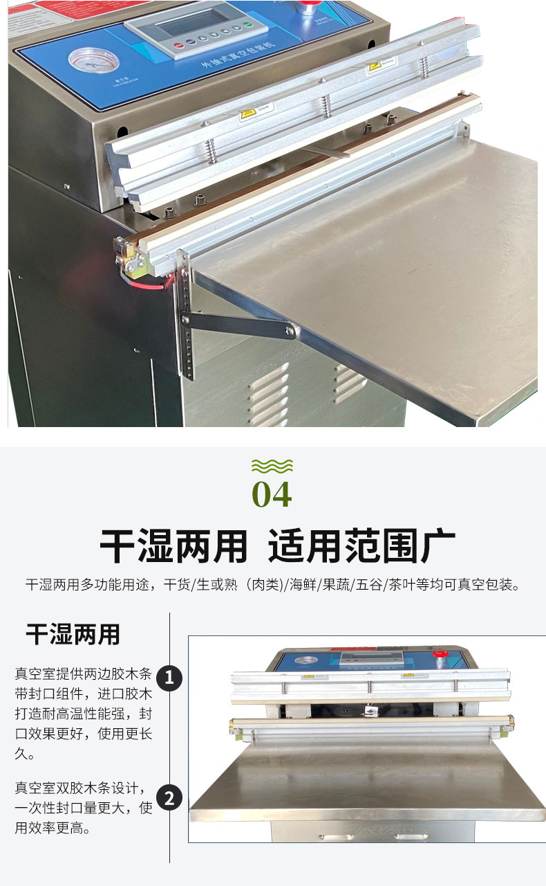 氣動外抽真空包裝機可用于各種食品的真空包裝,如海鮮、水果、茶葉、鹽漬物品、豆制品、肉類等