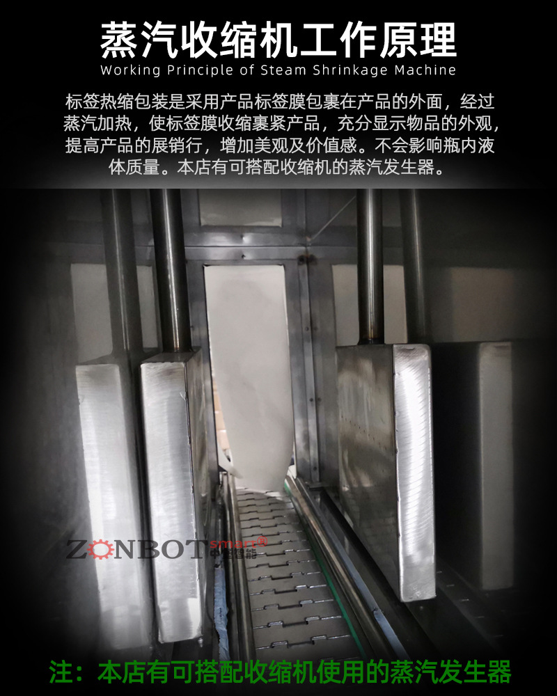 - 封切好的產(chǎn)品隨后被輸送到熱收縮區(qū)域。熱收縮區(qū)域一般通過熱風(fēng)、蒸汽或紅外線等方式提供熱量。如果是熱風(fēng)方式,熱風(fēng)機產(chǎn)生的高溫空氣在收縮通道內(nèi)循環(huán),使薄膜受熱收縮;若是蒸汽方式,蒸汽包圍產(chǎn)品促使薄膜收縮;紅外線方式則是利用紅外線輻射讓薄膜分子運動加劇而收縮。在熱收縮過程中,薄膜在熱量的作用下逐漸收縮,緊密地包裹住產(chǎn)品,最后經(jīng)過冷卻通道定型。
