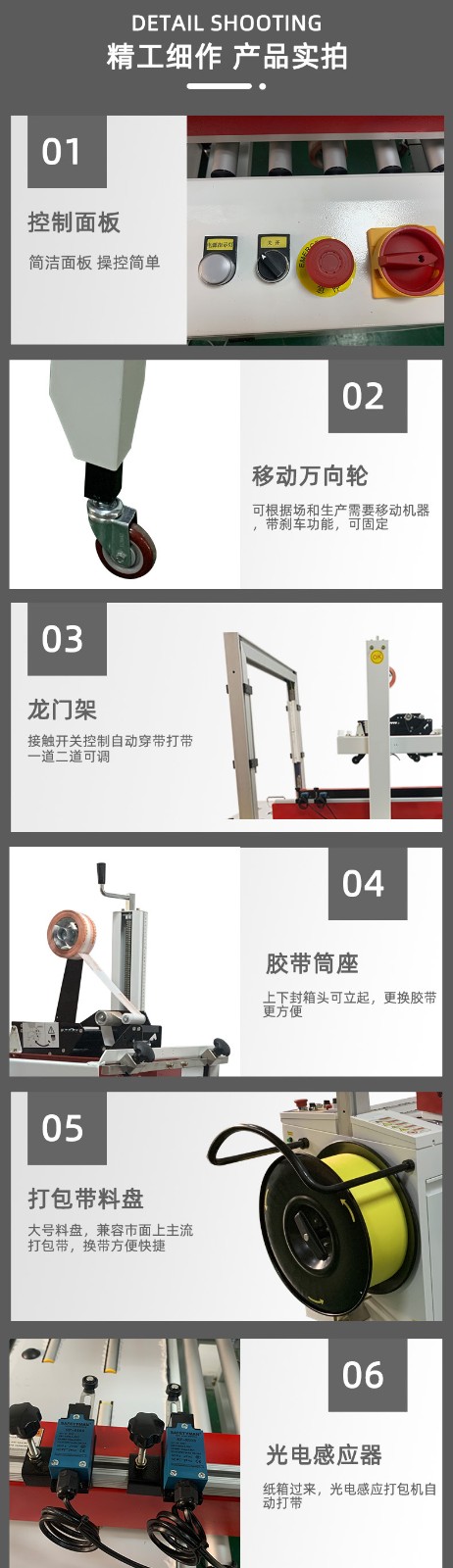 - 打包帶供給裝置:儲存有足夠長度的打包帶,通常是成卷放置。在打包過程中,打包帶會從卷上被抽出并輸送到工作區域。打包帶的材質多樣,有塑料打包帶、鋼帶等,不同的材質適用于不同重量和類型的產品包裝。