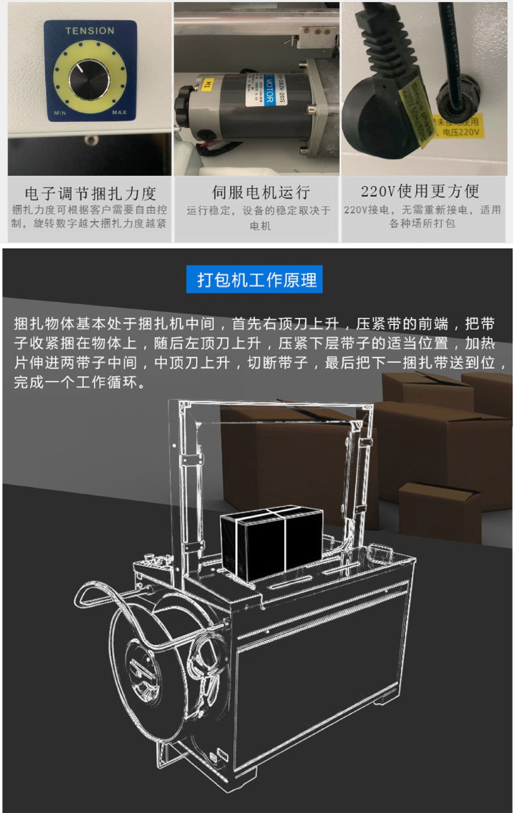 - 家電產品在生產完成后,無論是大型家電如冰箱、洗衣機,還是小型家電如電水壺、電吹風等,都需要進行包裝和捆扎。自動捆扎機可以根據家電產品的大小和重量,選擇合適的打包帶(如塑料帶或聚酯帶)對產品的包裝箱進行捆扎。對于大型家電,捆扎機可以確保包裝箱在搬運和運輸過程中不會散開,保護產品不受損壞。