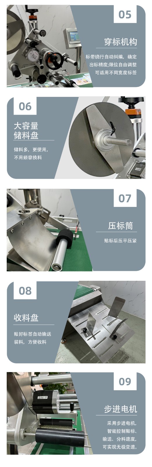 緊接著,分離后的標簽或產品快速進入貼標環節。貼標機構采用先進的傳感技術與高精度貼標頭,當產品通過輸送線到達指定貼標位置時,傳感器瞬間捕捉到信號,并即刻將指令傳達至貼標頭。貼標頭以極快的響應速度,將標簽從卷狀材料上精準剝離,隨后以恰到好處的壓力和速度,將標簽平整、牢固地貼附在產品表面。整個貼標過程一氣呵成,動作流暢且連貫,幾乎沒有絲毫停頓。