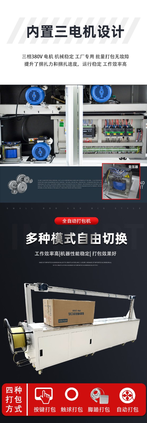 - 半自動打包機:適用于小型工廠、商店、快遞公司網點、辦公室等,這些地方打包量相對較小,使用半自動打包機既能滿足打包需求,又能在設備成本和人工成本之間取得較好的平衡