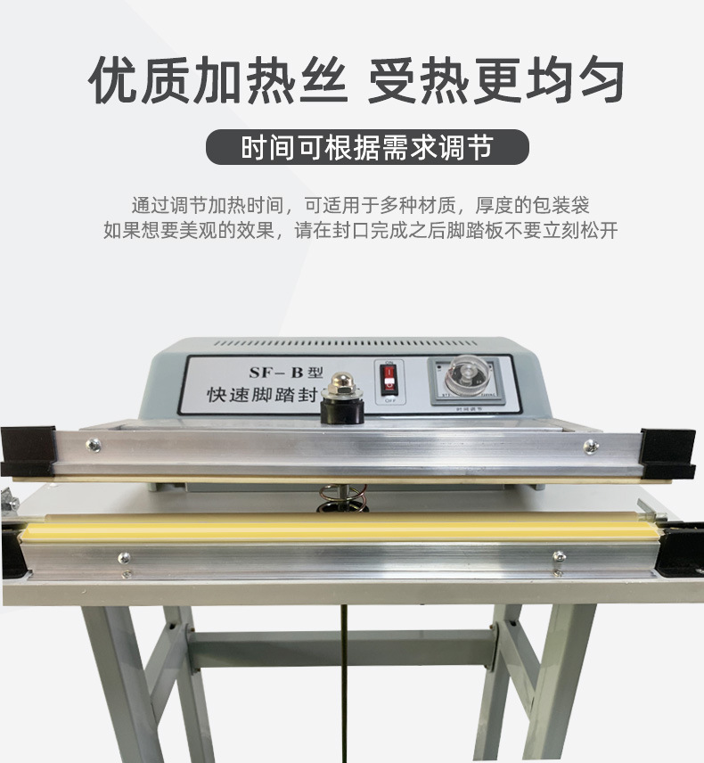 此外,?腳踏封口機還適用于各種塑料薄膜、?復合薄膜及鋁塑薄膜的封合,?廣泛應用于食品、?土特產、?糖果、?茶葉、?醫藥、?五金等行業。?這種設備的操作簡單,?加熱時間可調,?接通電源即可工作,?使得它在商店、?家庭、?工廠等環境中成為方便且經濟的封口解決方案