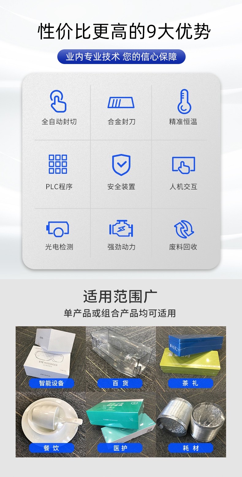 相比水平封切、半自動收縮機,全自動垂直封切熱收縮包裝機的核心優(yōu)勢集中在 “適配性、效率、穩(wěn)定性” 三大維度: