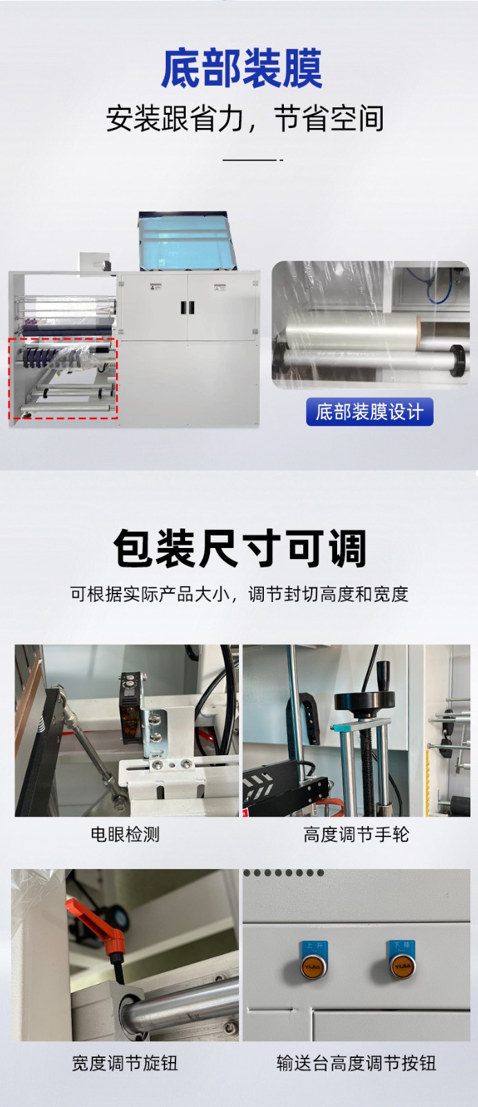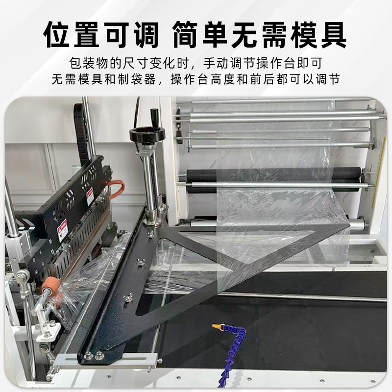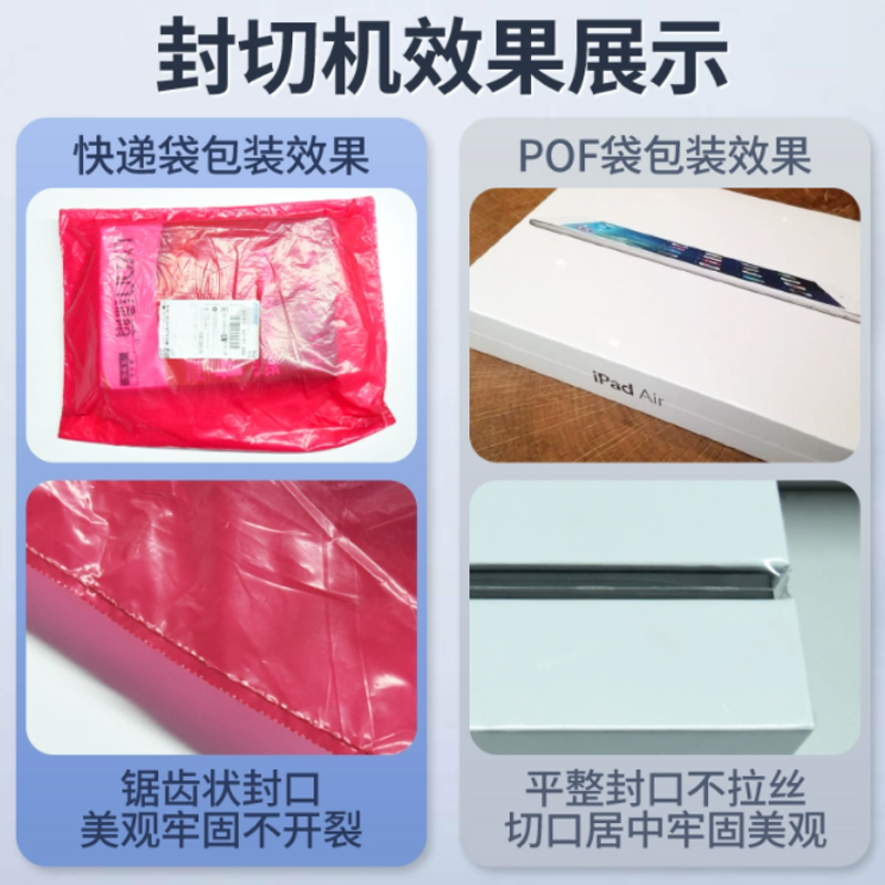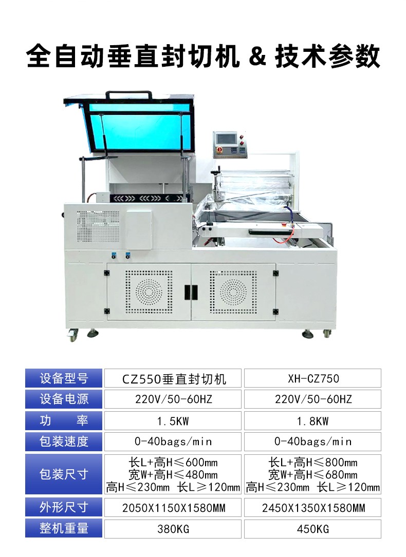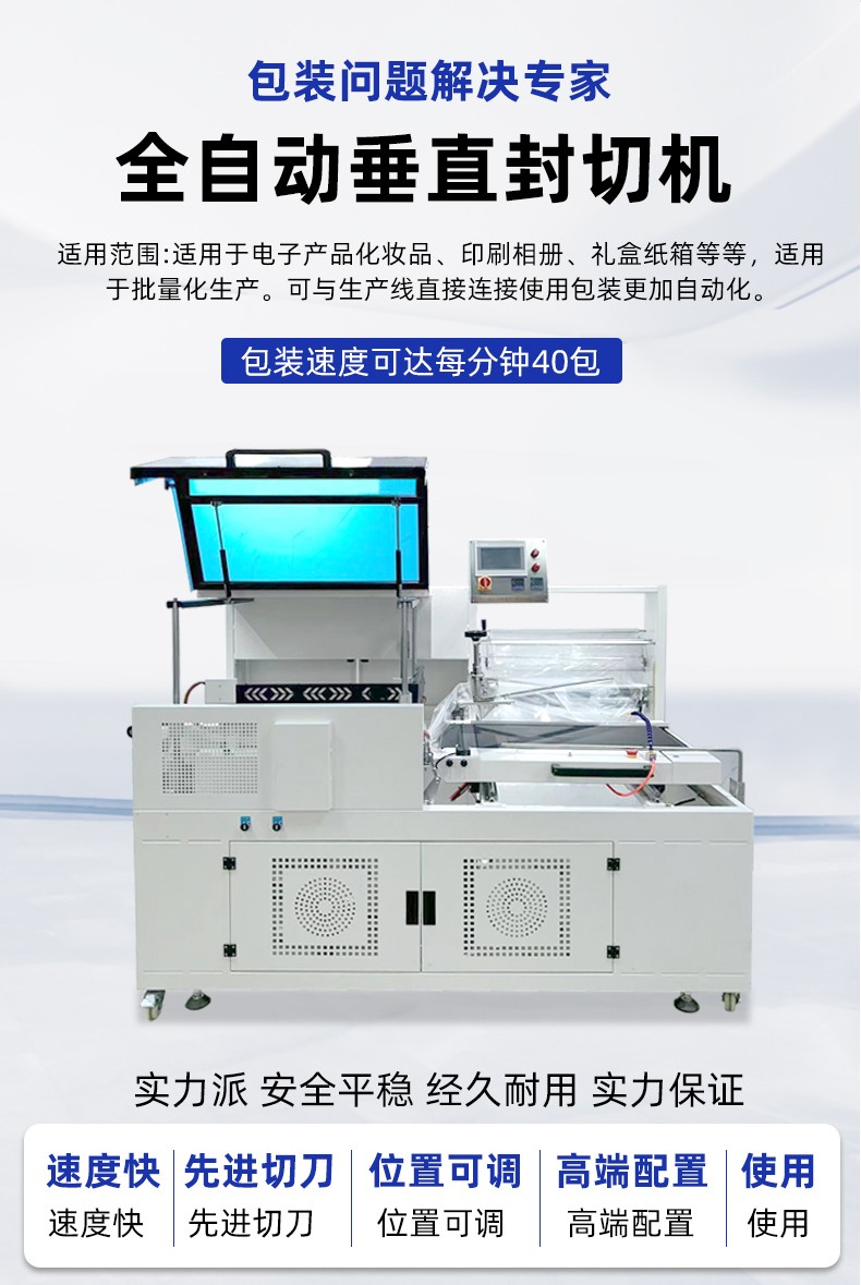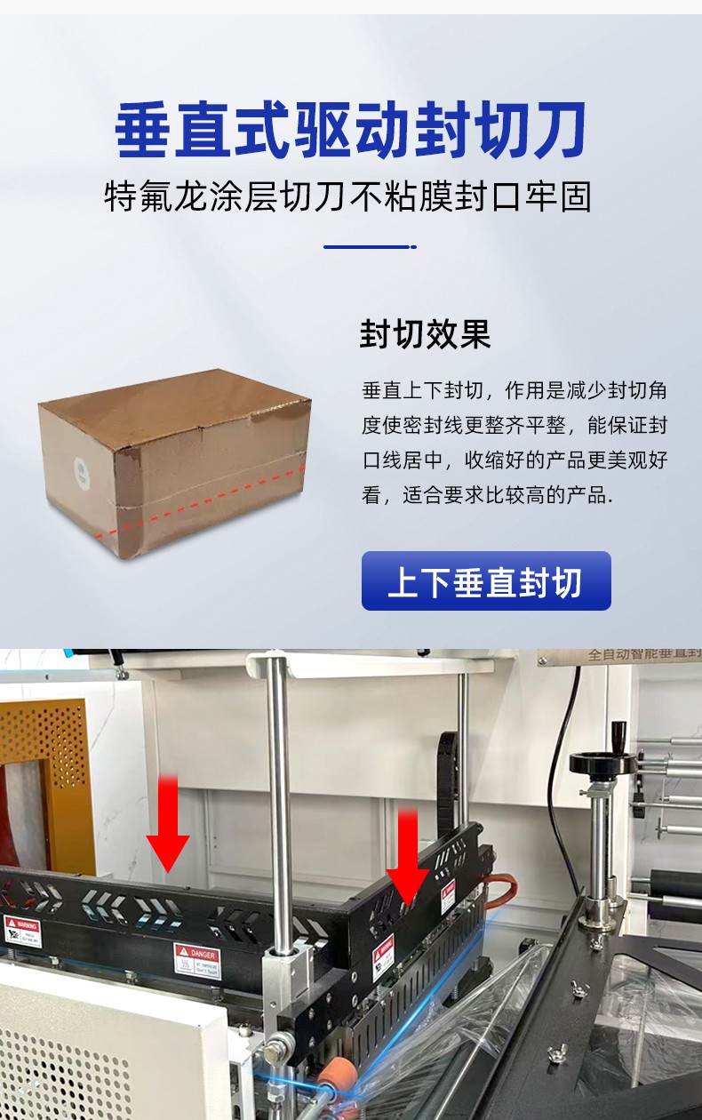 存放熱收縮膜卷(如 POF、PVC、PE 膜),配備自動張力控制器,確保膜材勻速、平穩(wěn)輸送,避免膜材褶皺或斷裂(部分機型支持 “雙膜卷切換”,減少換膜停機時間)。 - 垂直封切機構: