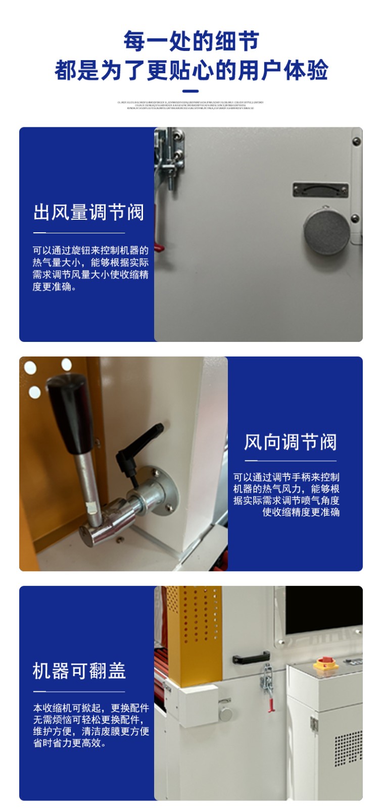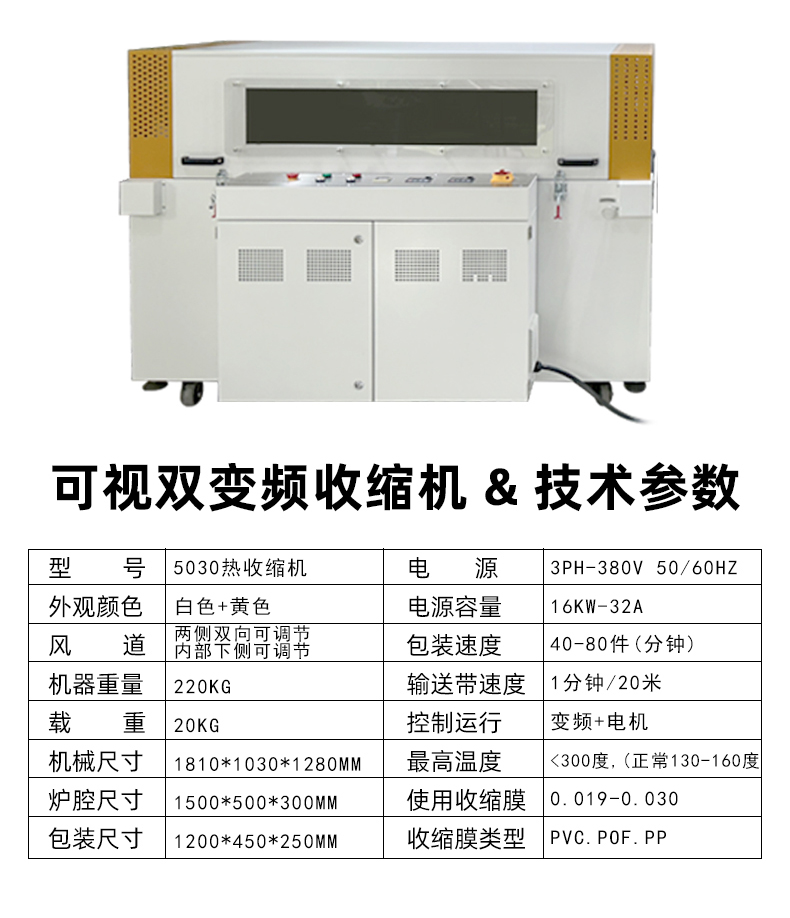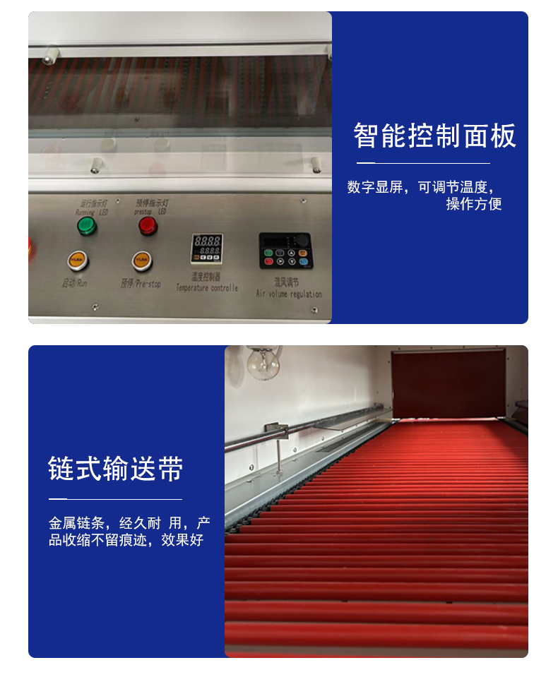 封切后的 “膜 + 產品” 進入通道,內部通過熱風循環(huán)系統(tǒng)(多組發(fā)熱管 + 離心風機)產生均勻熱風,使膜材受熱收縮并緊密貼合產品表面;通道溫度、風速、輸送速度可精準調節(jié),適配不同材質的膜(如 POF 膜需 120-180℃,PE 膜需 180-220℃)。 - 輸送系統(tǒng):