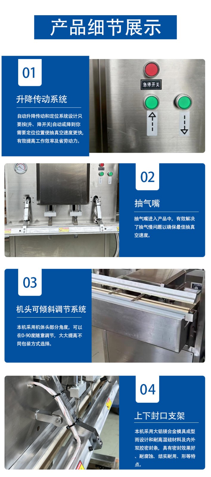 • 操作簡便:通常配備 PLC 觸摸屏控制,人機交互界面友好,操作簡單直觀,工作人員可以方便地設置各種參數,如真空度、封口溫度、封口時間等,降低了操作難度,提高了工作效率