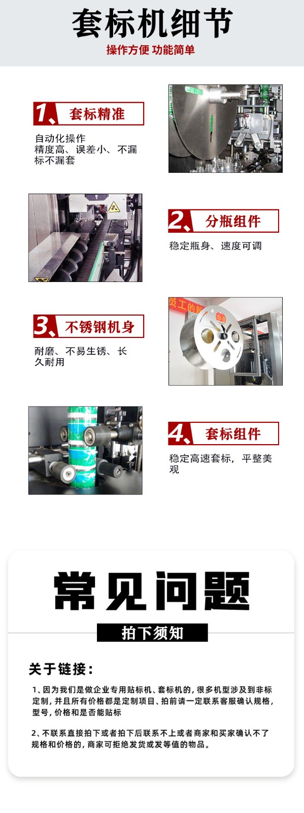 工作原理:全自動套標機通過程式控制系統或電力控制系統實現自動檢測、標簽取放、自動套標等功能。其工作過程一般為,首先容器通過輸送帶系統輸送至套標位置,標簽收卷系統將標簽卷展開,經過送標組將標簽準確地輸送到切刀位置,切刀按照設定的尺寸將標簽切斷,然后通過貼標頭部分將切斷的標簽套在容器上,最后可能還會有熱收縮等后續處理工序,使標簽緊密貼合在容器上。 結構組成 輸送機構:包括輸送帶、帶瓶定位皮帶、分瓶螺桿等,采用變頻器同步器控制各傳動馬達,可通過調整一個旋鈕來輕松調整整機運行速度,確保容器穩定、準確地輸送到套標位