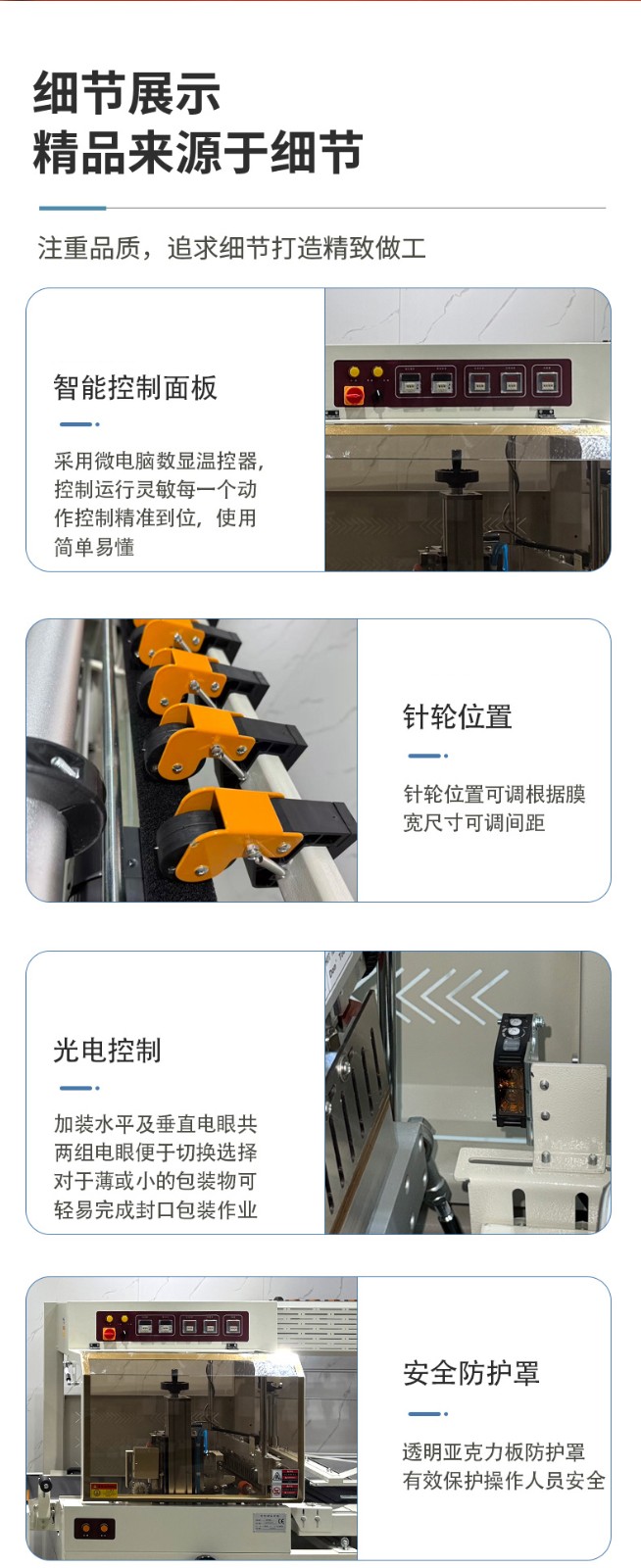 - 封切效果好5:封切刀通常采用杜邦特弗龍涂層抗粘耐高溫鋁合金刀,封口牢固,不會開裂、焦化,且封口線直而美觀。部分設(shè)備還具備封切刀保護(hù)裝置,可防止誤切包裝物。