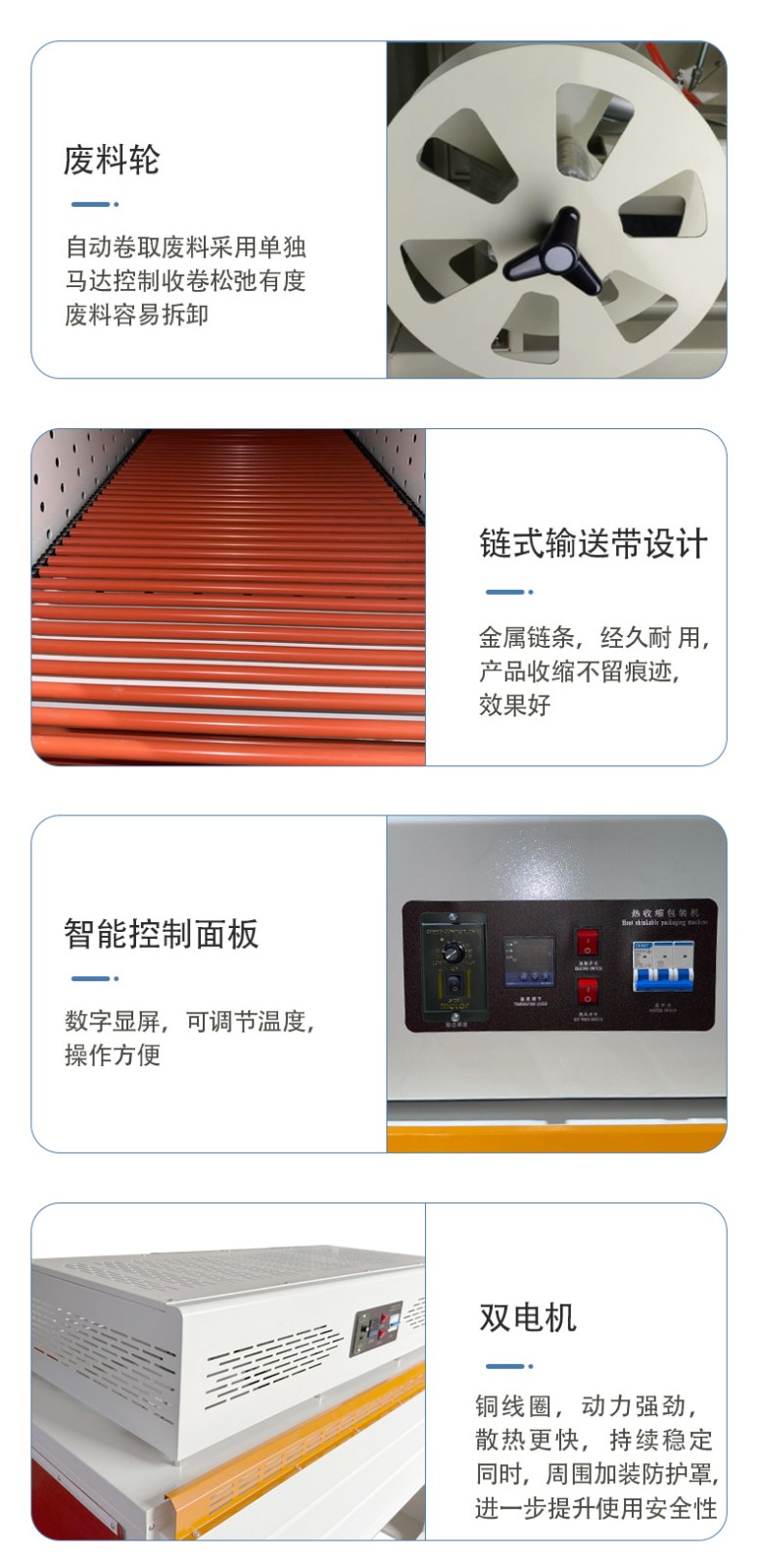 - 結(jié)構(gòu)組成:一般由封切裝置、熱收縮爐、輸送系統(tǒng)、送膜機(jī)構(gòu)和控制系統(tǒng)等組成。封切裝置用于對膜進(jìn)行封口和切斷;熱收縮爐提供熱量使膜收縮;輸送系統(tǒng)負(fù)責(zé)傳送產(chǎn)品和包裝好的物品;送膜機(jī)構(gòu)實現(xiàn)膜的輸送和定位;控制系統(tǒng)則用于設(shè)定和控制各部分的運(yùn)行參數(shù)。
